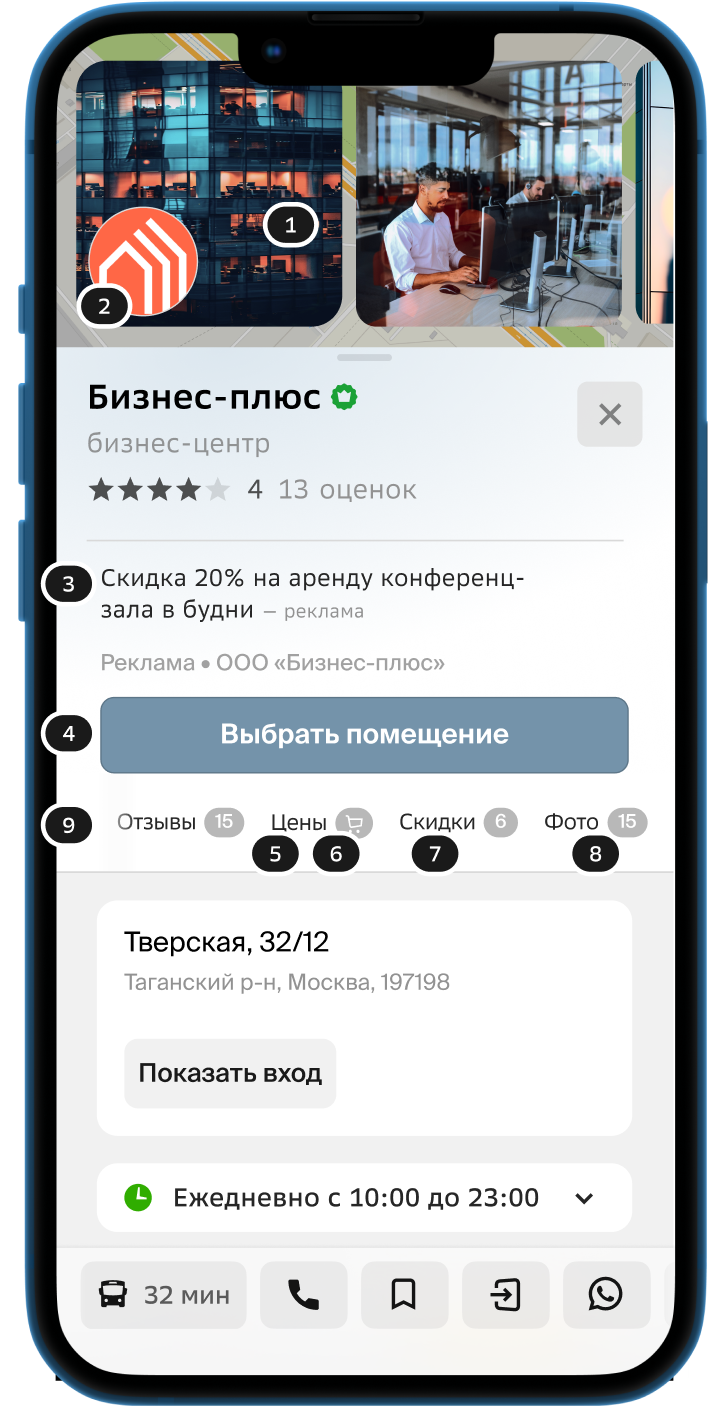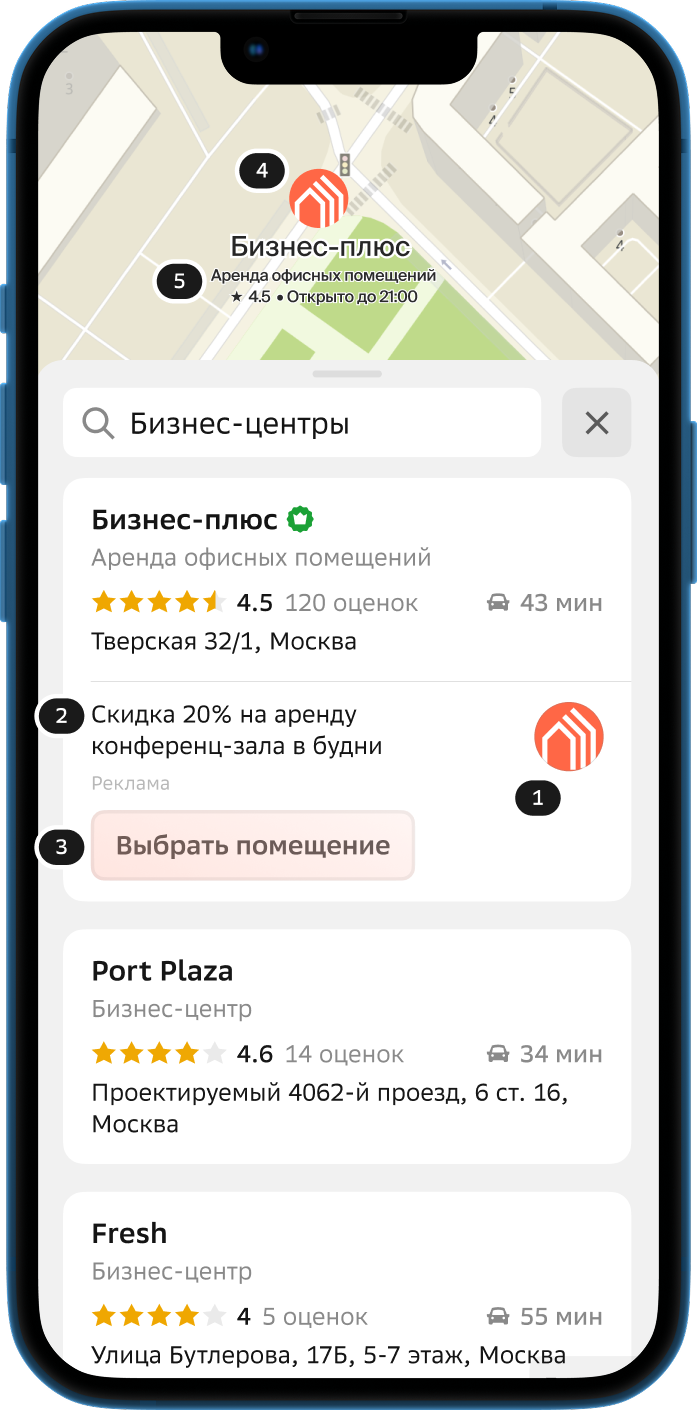 Прикрепляется к зданию, в котором находится компания, на месте входа в организацию. Привлекает внимание пользователя и побуждает перейти в карточку рекламодателя.