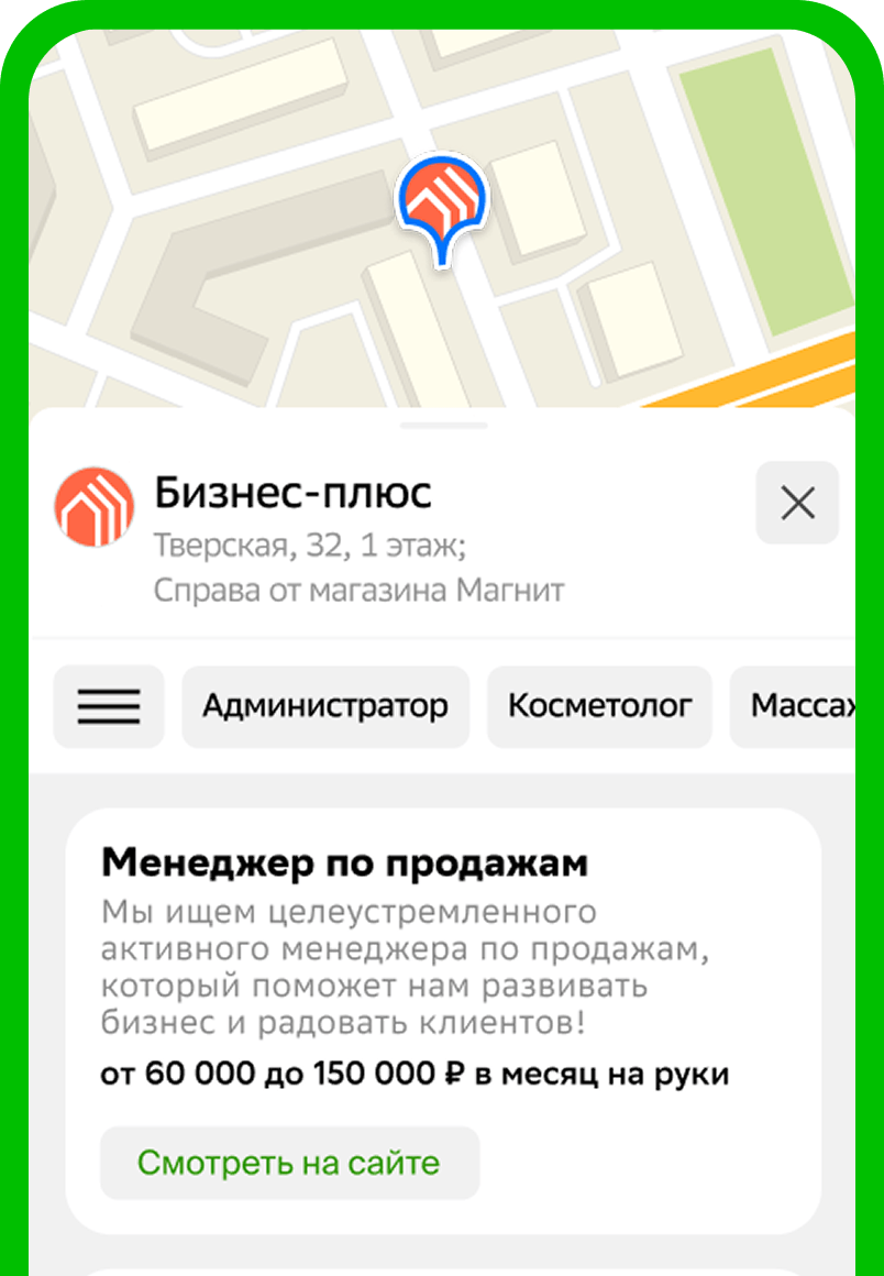 Вы уже используете геоконтекстную рекламу для привлечения клиентов. Теперь у вас есть возможность выделить свои вакансии среди других работодателей в слое «Работа».