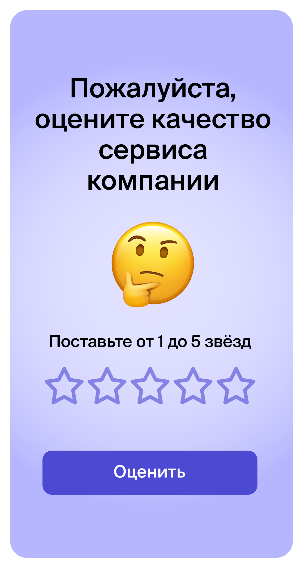Сервис «Отзывы Про» просит клиента оценить полученную услугу и в зависимости от оценки предлагает дальнейший шаг с учётом ваших настроек.